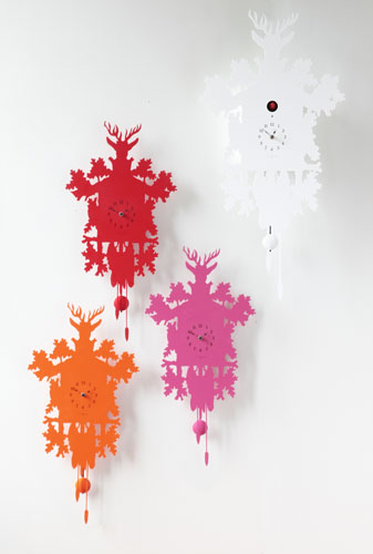 Cucu - Design: Pascal Tarabay pentru Diamantini & Domeniconi. O reprezentare 2D a clasicului ceas cu cuc. Este facut din lemn de mesteacan taiat cu laser si include si un cuc, ce isi face aparitia o data pe ora. Pret: 42 euro+TVA cucu baby, 193 euro + Tva Cucu mare.Intro