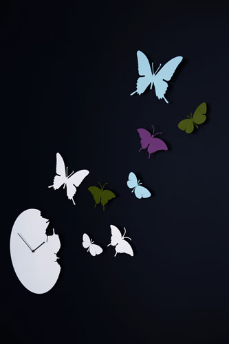 Butterfly - Design: Susanne Philippson pentru Diamantini & Domeniconi. O reprezentare poetica a timpului si a acelor momente din viata ce zboara precum fluturii. Ceas de perete din metal lacuit, disponibil cu un set de 3 fluturasi de marimi diferite. Pret: 640 lei cu TVA.Intro