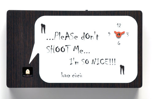 Cucuccomics - ceasul cu cuc revine in forta. Constient de deranjul fonic, Cucul care insoteste produsul vine si cu o rugaminte de nerefuzat: "Nu ma impusca! Sunt asa dragut!" Progetti design. Pret: la cerere. Morphoza-atelier de interioare