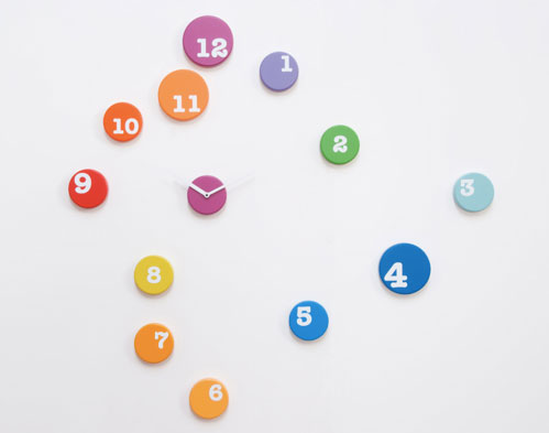 Fun Time - ceas de perete compus din 12 discuri din lemn colorat in culori vesele, ce pot fi montate aleatoriu. Progetti design. Morphoza-atelier de interioare
