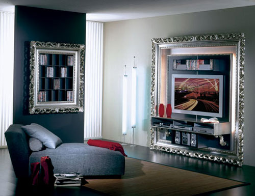 Baroque Home Cinema - Mobilierul realizat in stil baroque,imbina perfect eleganta si monumentalitatea stilului, cu functionalitatea stilului modern, hi-tech. Realizat din MDF furniruit si finisate cu foita de argint, mobilierul este perfect alaturi de suporturile pentru CD/DVD-uri si oglinzile cu rama baroque din aceeasi colectie. Dimensiuni: 222x51x224 cm.LCD 50". Pret la cerere.In exclusivitate prin Interior Store