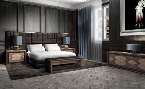 Master Mood - dormitor marca Smania cu pat cu structura din otel, tapisat cu piele si spatar fixat pe perete, versiune large si mobilier din lemn, cu nervurile scoase in evidenta prin lacuire. Morphoza-atelier de interioare