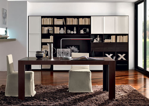 Diamante - Compozitie formata din biblioteca modulara Diamante, realizata din MDF furniruit cu finisaje stejar inchis si fronturi lacuite cu finisaje albe. Dimensiuni compozitie: 363x36,1/61,7x198 cm. Interiorul este completat de masa de dining Venus si scaunele Sofia. Pret la cerere.In exclusivitate prin Interior Store