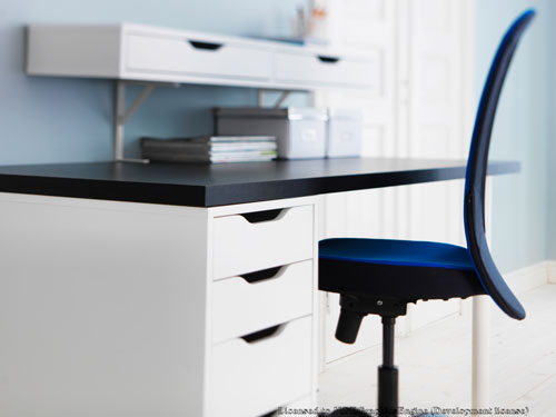 VIKA AMON/VIKA ALEX masa 419 lei - Otel cu protectie la coroziune. Lat150×A75, H72cm. EKBY ALEX/EKBY TORE polita blat 214 lei. PAL, MDF. Designer: Johanna Asshoff. Lat119×A28, H32cm. VILGOT scaun rotativ 299 lei Husa: 100% poliester. Albastru IKEA