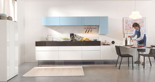 Cucina Leggera - bucatarie Lago realizata din componente modulare, placate cu sticla, masa cu picioare de sticla si scaune Steps. Morphoza-atelier de interioare