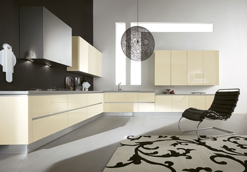 Atelier la Luce - mobilier de bucatarie Aster Cucine, cu design modern, materiale ce reflecta lumina si gole pentru deschiderea dulapurilor. Morphoza-atelier de interioare