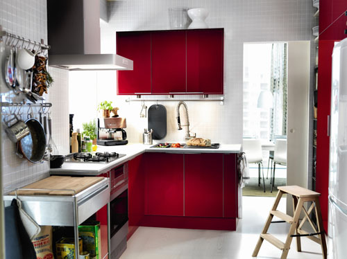 Bucatarie Faktum cu usi ABSTRAKT - rosu lucios. Include: 4 corpuri baza, 2 corpuri suspendate, panouri laterale, blat si manere. Usi ABSTRAKT din PAL melaminat. Manere STRECKET din aluminiu si blat de lucru NUMERAR alb laminat si margine cu aspect metalic. Pret: 3.690 lei.Chiuveta BOHOLMEN incastrabila, din otel inoxidabil - Pret: 499 lei.