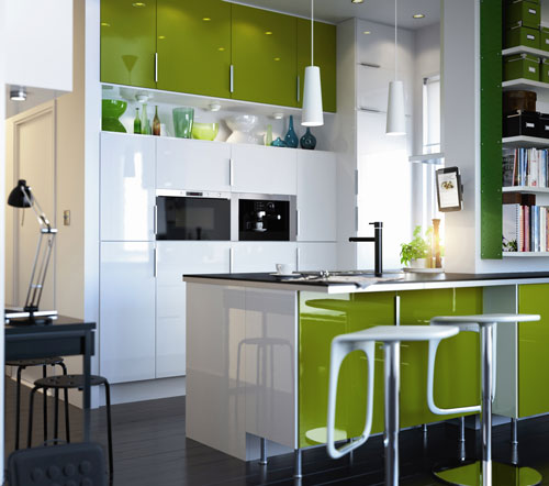 Bucatarie FAKTUM cu usi si fronturi de sertar ABSTRAKT alb lucios si usi RUBRIK ABSTRAKT verde lucios - Include: 14 corpuri suspendate, 1 corp inalt, manere si panouri laterale. Usi/fronturi de sertare ABSTRAKT si usi RUBRIK ABSTRAKT din PAL melaminat. Manere din aluminiu STRECKET si blat de lucru negru laminat NUMERAR cu margine cu aspect metalic. Pret: 4.969 lei.Bucatarie FAKTUM cu usi SOFIELUND aspect nuc gri deschis, usi si fronturi de sertare ABSTRAKT crem, lucioase. Usile si fronturile sunt realizate din PAL melaminat. Include: 5 corpuri baza, 2 corpuri inalte, 3 corpuri suspendate, panouri laterale, manere din aluminiu nichelat slefuit si blat de lucru laminat, cu aspect nuc gri inchis. Pret: 8.690 lei.