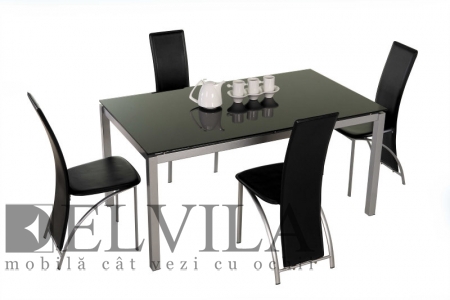 Masa HWT 150 si scaune sufragerie HWC 071 - Ansamblu compus din: masa, L160xA76xH90 cm, cadru metalic cromat, blat sticla neagra, 4 scaune, L44xA45xH97 cm, cadru metalic, piele ecologica, Componentele se pot vinde si separat. Pret: 1.037 lei.Produs disponibil prin magazinele Elvila, www.elvila.ro