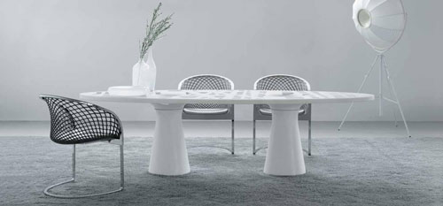 Haussmann - Masa Haussmann cu un design unic, realizata din marmura, cu spatii de trecere pentru cablurile aparaturii electronice si sticla clara. 140x140x73 cm sau 270x110x73 cm.