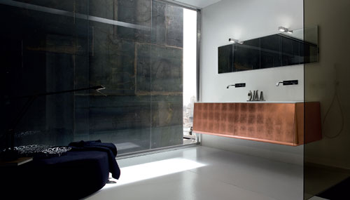 Campus - Compozitie realizata din MDF, cu finisaje din foite de cupru, top cu lavoar incastrat realizat din Korakril. Dimensiuni totale 200x54x202 cm. Pret la cerereIn exclusivitate prin Interior Store