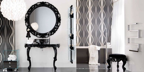 Black&White - amenajare pe alb si negru by Moda Collection constand in lavoasr Well Glam, comoda de sticla pe rotile Twice, taburete Loop si Oglinda Elle. Morphoza-atelier de interioare