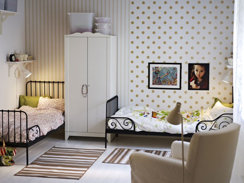 MINNEN - Cadru pat cu suporti de lemn, negru-maro. Pret: 409 lei.HENSVIK - Dulap de haine, alb. Pret: 379 lei.