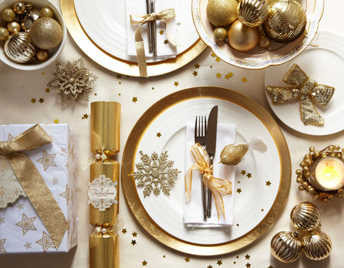 Pentru o masa de Craciun festiva si eleganta, iti recomandam sa abordezi stilul glamour. Foloseste farfurii aurii sau argintii si decoreaza masa astfel incat sa fie cat mai stralucitoare si somptuoasa. Scoate in evidenta farfuriile aurii, folosind o fata de masa, preferabil, alba. Ca accesorii, utilizeaza tot unele aurii. Umple un vas cu globuri aurii si decoreaza masa cu funde si margele in aceeasi culoare.Foto: Tesco Christmas 2011