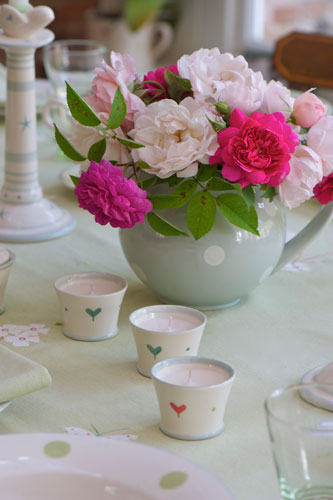 Nu in ultimul rand, nu trebuie sa uiti de aranjamentul central, fiind vorba de o masa festiva. Creeaza un aranjament floral, compus din mai multe tipuri de flori albe si in nuante de roz. Le poti amplasa intr-o vaza din ceramica, cu aspect vintage, sau intr-un ceainic ori intr-o stropitoare. In acest fel, iti vei impresiona, cu siguranta, invitatii.Foto: Susie Watson Designs