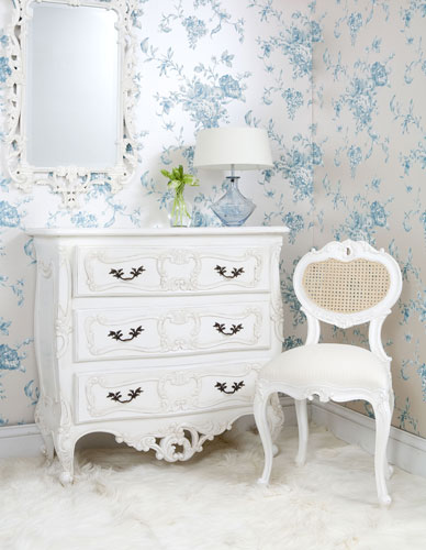 Un alt tip de tapet pentru care poti opta este cel cu aspect vintage. Acest curent s-a raspandit in intreaga lume si s-a infiltrat nu numai in amenajarile interioare, ci si in moda. Pentru a-ti decora dormitorul in stil vintage, foloseste mobilier alb, cu aspect uzat si linii curbe. Tapetul de inspiratie vintage are motive florale, asemenea stilului rustic si este realizat in culori pastelate, precum bleu, crem, roz pal, culoarea piersicii, culoarea oului de rata. Foto: French Bedroom Company