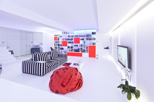 Majoritatea pieselor de mobilier este realizata la comanda. Lavoarul negru (care face parte din colectia "Pear", semnata de Patricia Urquiola), a fost, de asemenea, creata la comanda, conform dorintelor designerilor, fiind creata in varianta de negru, in locul celei pe alb. Scaunul este, la randul sau, o piesa de mobilier de sine statatoare, apartinand colectiei "Noodle chair", conceputa de Arne Quinze.