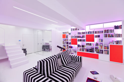 Proiectul de fata reprezinta amenajarea unui apartament cu doua niveluri, din Bucuresti. Scopul designerilor a fost acela de a crea un interior modern, spatios si luminos. Suprafetele plane, din oglinda realizeaza un joc intre realitate si iluzie optica, in felul acesta, interiorul parand mult mai spatios. Albul imaculat joaca un rol important in designul apartamentului, acesta creand o combinatie expresiva alaturi de piesele de mobilier colorate.