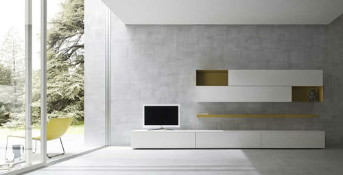 Slim - compozitie Dall Agnese de living care ne indeamna sa descoperim culoarea. Frontul din material alb, lacuit-lucios ascunde interiorul cu finisaj verde olive.Morphoza - atelier de interioare