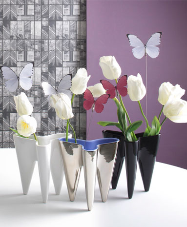 Tricorno Piccolo - vase cermanice, Adriani e Rossi, cu 3 picioare, cu smaltul exterior in varianta metalica, alba sau neagra si interiorul in nuante intense de verde, galben, albastru, rosu, portocaliu, roz, mov. Dimensiuni25x24 cm.Morphoza - atelier de interioare