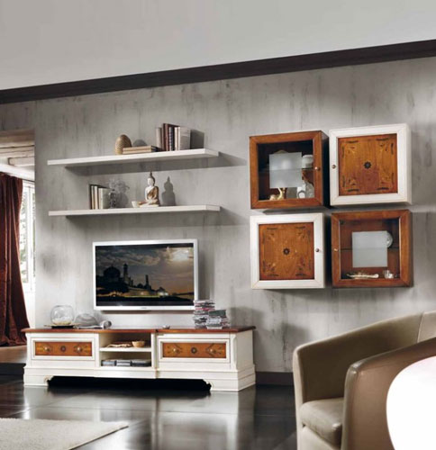Mobilier living din colectia Carpe Diem, realizat din lemn lacuit sau cu finisaje natur. Compozitia cuprinde: comoda TV 200 x 52 x 50 cm, corpuri suspendate cu usa din lemn sau sticla 60 x 33 x 60 cm; polite suspendate. Pret la cerere