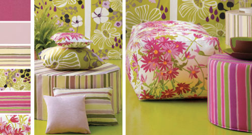 Eden - linie de produse Doimo Decor formata din pernute decorative si taburete de tip puf, cu huse intr-o paleta cromatica fresh - verde crud, roz, lila, nuante deschise de maro.