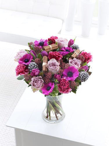 Pentru un aranjament floral in nuante de mov si roz, poti opta pentru unul ca cel din imagine. Pentru acesta, ai nevoie de trandafiri lila, de liliac japonez (skimmia japonica), lalele violet si anemone. Pentru contrast, poti adauga cateva flori galbene.