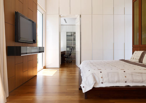 Al doilea nivel al constructiei este dedicat zonei private. Un sistem inteligent de jaluzele din aluminiu a fost montat la acest etaj, cu scopul de a filtra lumina si de a asigura intimitate locuitorilor.