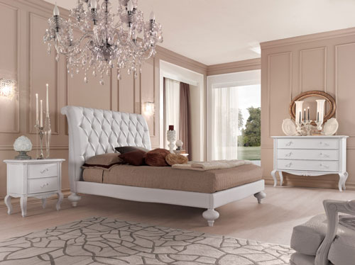 Celine - Dormitor clasic, compus din Pat Celine, tapisat cu piele si capitonat, 167 x 230 x 140 cm; comoda cu trei sertare 132 x 58 x 101 cm, si noptiera Celine, 61 x 41 x 67 cm, realizate din lemn masiv albit si decorate manual. Pret la cerere.
