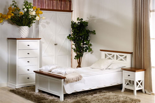 Elizabeth - Mobila pentru dormitor. Stilul londonez este vizibil in geometria mobilierului, in regularitatea si repetarea liniilor formand un ritm optic. Finisajul bicolor creeaza o interesanta perspectiva vizuala, iar combinarea unei culori neutre cu una calda ofera pretiozitate intregului spatiu. Albul mat iti da senzatia de liniste si puritate, in timp ce blatul de culoarea mierii, incalzeste si face placuta ambianta.