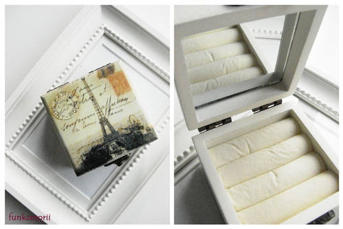 Cutie pentru bijuterii shabby chic, alba, cu Turnul Eiffel. Dimensiuni cutie: 7x7x4 cm. Pret: 35 lei.