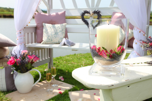 Alte elemente caracteristice stilului shabby chic sunt lumanarile. Impanzeste intreaga zona cu lumanari, de diferite forme si dimensiuni. Acestea le poti amplasa in pahare, pe platouri de prajituri, in borcane deocrate cu funde si sfoara sau in candele metalice, albe.