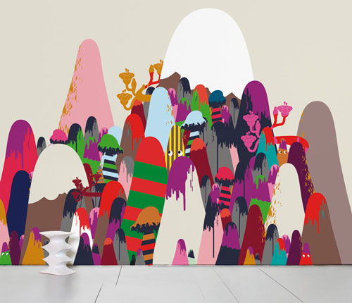 Mountains - Design: Kustaa Saksi. Imaginatia unica cu radacini pur scandinave se reflecta clar in lucrarile designerului Kustaa Saksi. Mountains de exemplu este un tapet de perete ce ilustreaza un peisaj suprarealist, plin de culoare si atmosfera vie. Dimensiuni: 372 x300 cm. Brand: Domestic. Pret: 2.265 lei cu TVA