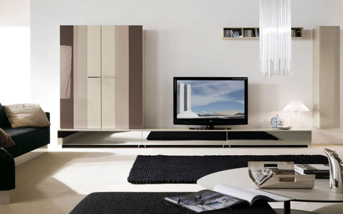 All Day - Compozitie din colectia All Day, ideala pentru orice living modern. Finisaje lacuite lucios in nuante de nud, bej si maro si oglinda bronz. 458 x 61 x 199 cm. Pret: 6.112 euro + TVA