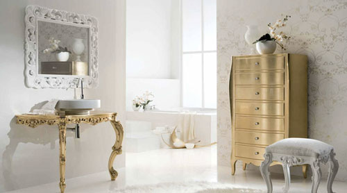 Concept Moda Collection 2 - o amenajare glam cu tente baroc compusa din oglinda cu rama dantelata alba, Replica, suport lavoar Well Glam cu prindere pe perete si sustinere pe doua picioare elaborat sculptate in lemn cu finisaj auriu, taburete Free din lemn finisat alb, tapitat cu catifea si comoda inalta cu sertare Set 1.