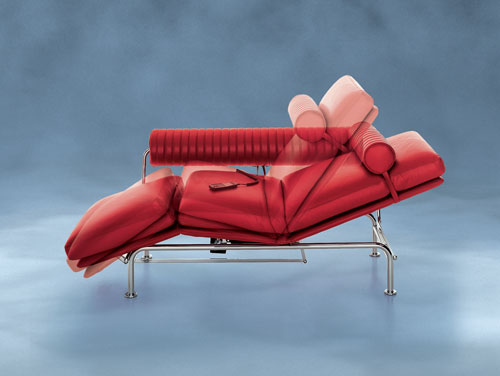 Up&Down - Lounge realizat pe cadru metalic tubular, cu structura poliuretanica si tapiserie din material textil sau piele. Reglarea acestuia se face electronic, cu ajutorul unei pompe de gaz. Dimensiuni: 160/199x96x73/104 cm. Pret: de la 3.249 euro+ TVA