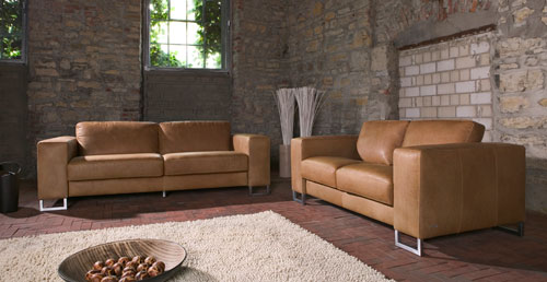 Canapea din piele naturala de culoare maro, foarte confortabila, cu suport din fier forjat, ce face parte din colectia Incanto. Pret la cerere.