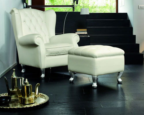 Bergere - clasicul fotoliu Bergere isi gaseste o reinterpretare Doimo Sofas, pe capitonaj de piele crem deschis cu taburete pentru picioare.