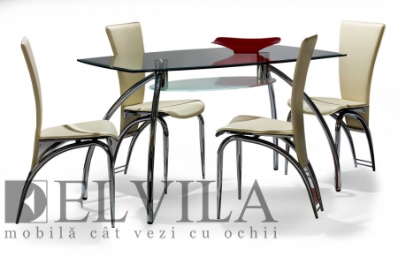 Masa HWT 036 si 4 scaune bucatarie HWC 037 - Masa si scaune bucatarie: masa, L135xA80xH76 cm; sticla securizata; picioare cromate, 557 lei. 4 scaune, L41xA50xH90 cm; tapitat piele ecologica; picioare cromate, 150 lei/buc. Componenetele se pot vinde si separat.