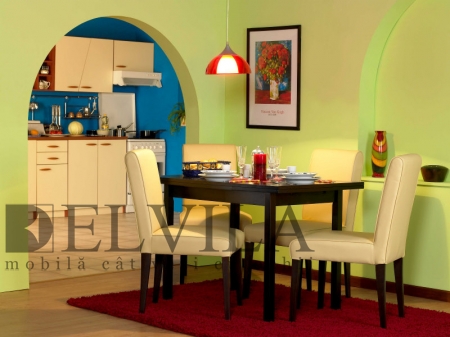 Masa si scaune bucatarie FULDA - Ansamblu compus din: Masa ext. L110/180xA70xH76 cm, 4 scaune, L45xA43xH94 cm. Pret: 959 lei.