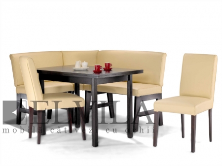 Grup de colt bucatarie FULDA - Grupa de colt bucatarie compusa din: masa extensibila,L110/180xA70xH76 cm, bancheta, L156xA122xH93 cm, 2 scaune, L45xA43xH94 cm. Componentele se pot vinde si separat. Pret ansamblu: 1.297 lei.
