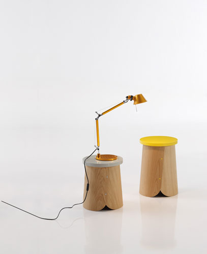 Tab - Design: Nadadora, 2011. Tab reprezinta o colectie de taburete si masute cu diferite inaltimi. Baza este realizata din furnir curbat de castan, iar blatul din castan furniruit lacuit in diverse culori. Sursa de inspiratie pentru crearea bazei reprezinta "trobos", un cuvant ce provine din limba spaniola si ce descrie niste stupi de albine realizati din buturugi scobite, tipic peninsulei Iberice. Dimensiuni: diametru 31 x inaltime 45 cm sau 31 x 36