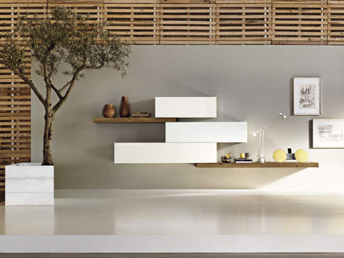 36e8 - Compozitie de living, Lago design, realizata din corpuri suspendate din MDF finisat mat si lemn in finisaj natural.