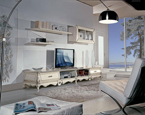 Leonardo - Comoda TV din colectia Leonardo, realizata din lemn masiv albit, cu un design clasic reinterpretat, cu o nota de eleganta si rafinament unica. 320 x 60 x 47 cm. Pret: 3.348,25 Euro + TVA