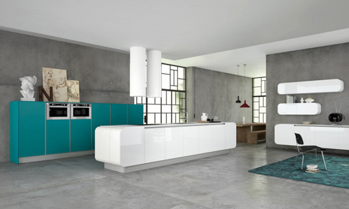 Numero Uno - bucataria poarta semnatura brandului Doimo Cucine si se descrie in linii fluide cu colturi rotunjite si suprafete lucioase. Aceasta colectie de bucatarii se evidentiaza si pe contrastul puternic dintre albul imaculat din zona insulei ori corpurilor suspendate si frumoasa nuanta turcoaz, o culoare in trend care imbraca zona de coloane destinate depozitarii si incastrarii aparatelor electrocasnice.