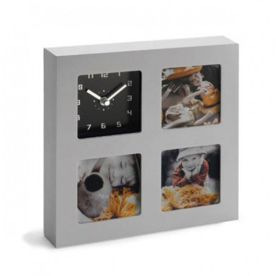 Ceas rama cu 3 poze - Ceas analogic cu trei rame foto, pentru a-i avea pe cei dragi mereu langa tine. Acest produs poate fi folosit fie pe perete fie pe birou, pozele sunt introduse impingand cele doua butoane pentru a elibera panoul din spate. Bateriile sunt incluse. Dimensiuni ceas: 19.7 x 19.7 x 3.8 cm. Pret: 58 lei.