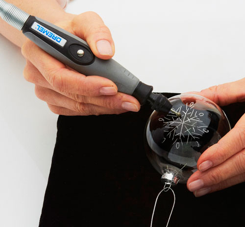 Indoiti materialul moale, pentru a crea o suprafata amortizata si asezati globul de sticla transparenta pe aceasta. Luati unealta dvs. Dremel 3000 cu axul flexibil atasat, introduceti freza de gravura cu disc de diamant 7105 si gravati o serie de modele de fulgi de zapada, mai mici sau mai mari, in mod aleatoriu, pe glob, lasand spatii intre modele. Trebuie sa fiti foarte delicati si in niciun caz nu trebuie sa apasati pe suprafata, deoarece aceasta va sparge globul fragil de sticla. Asigurati-va de faptul ca purtati ochelarii de protectie Dremel.