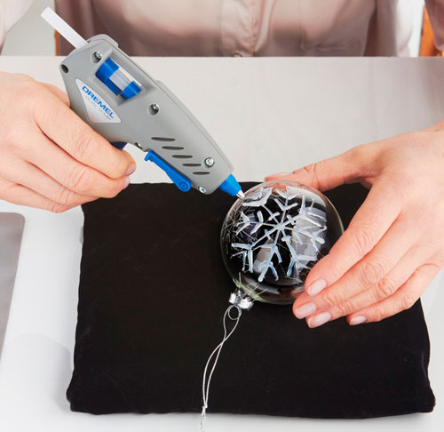 Introduceti o bagheta de lipit transparenta de 7 mm in pistolul de lipit cu temperatura duala 930 si asezati-l pe suportul de lipit Dremel. Conectati pistolul pe temperatura joasa inainte de a-l lasa sa se incalzeasca. Utilizati apoi pistolul de lipit Dremel 930 pentru a desena motive delicate cu fulgi de zapada intre fulgii de zapada gravati.