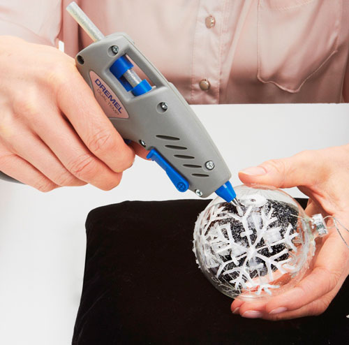 Permiteti pistolului de lipit Dremel 930 sa se raceasca, apoi introduceti o bagheta de lipit argintie cu sclipici. Avand pistolul de lipit setat pe temperatura joasa, aplicati lipiciul cu sclipici argintiu, pentru a dezvolta si a decora suplimentar motivele gravate, utilizand imaginea finala ca punct de reper. Agatati globul finisat.