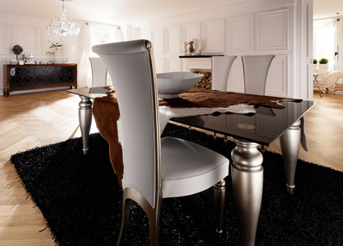 Lara & Tzar - un dining Selva, perfect pentru sarbatori elegante. Produse din lemn masiv, finisaj argintiu, scaune tapitate in catifea alba.
